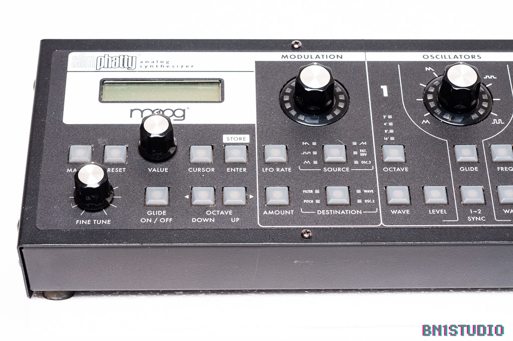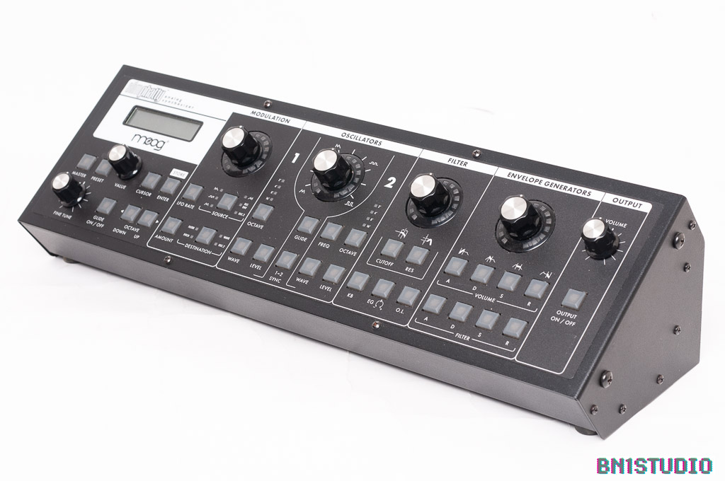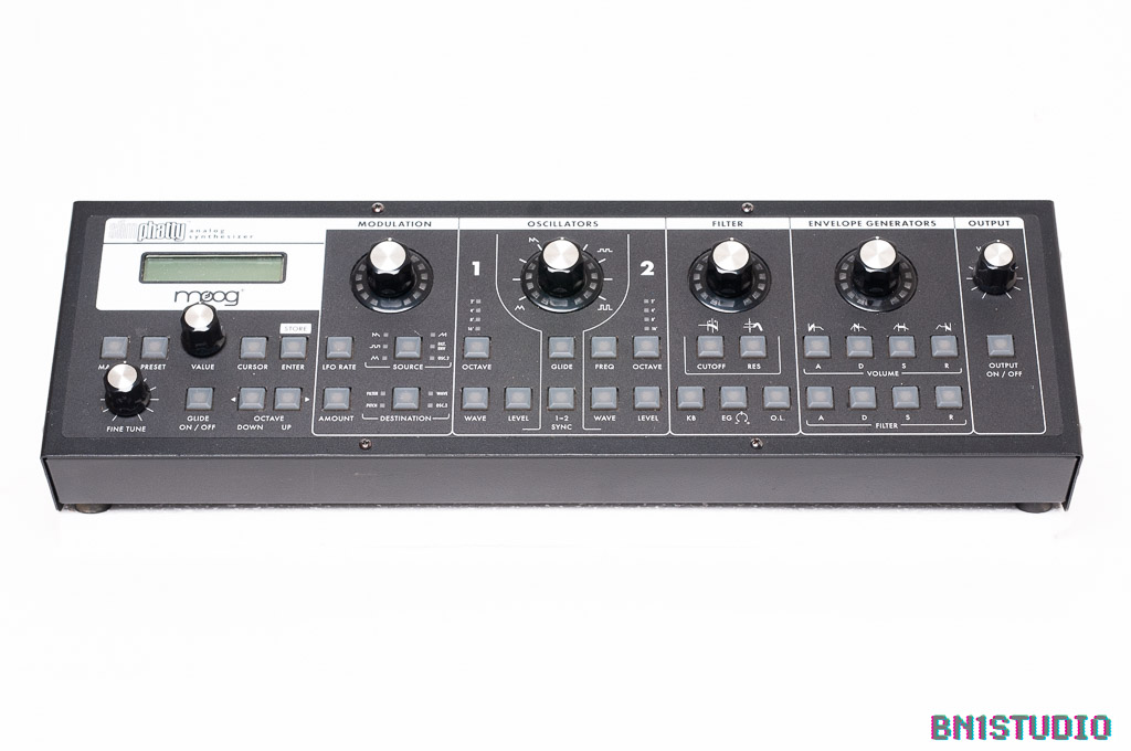 One of my favourites, the Slim Phatty is the rackmount version of the compact Moog Sub Phatty synth. A monophonic synth in the style of the original Minimoog, the Slim Phatty combines the best of traditional Moog – two oscillators, Moog filter & external CV, Gate & audio inputs – with modern features such as Midi (OG and USB), user memories and configurable routing