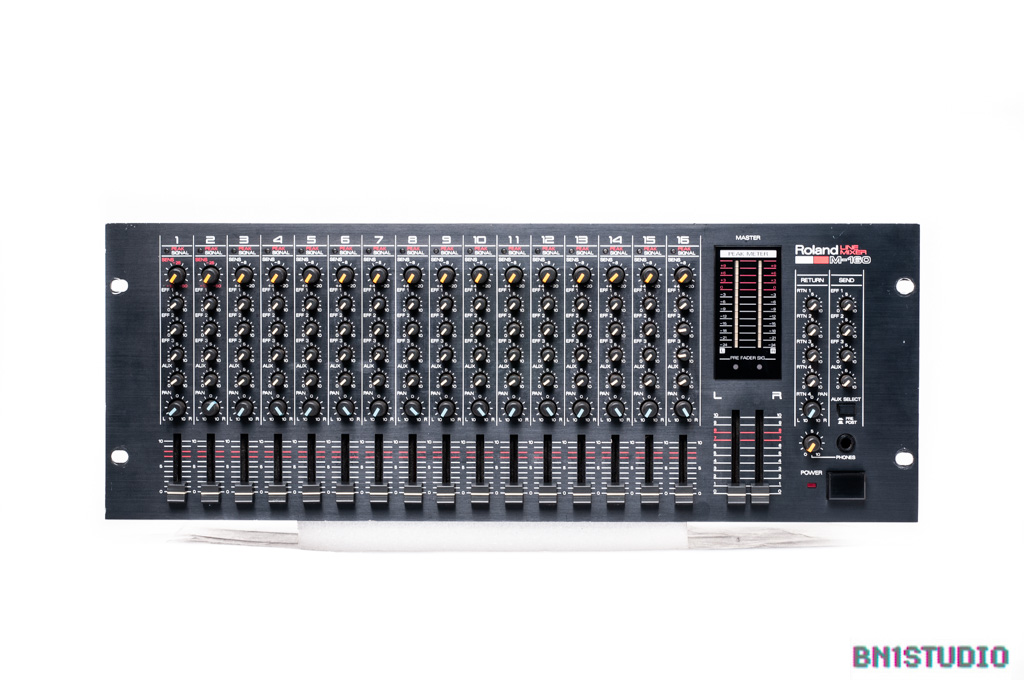 Everyone likes a rack mixer… Roland had a great range of rack mixers with 8,12, 16,24 & 48 channels, all in a similar style. The M-160 is a straightforward line-level mixer with four cue/ echo sends per channel, stereo echo returns (1-3, return 4 is mono)and two mic preamps. Ins & outs are all on jacks, with stereo line outs on XLRs