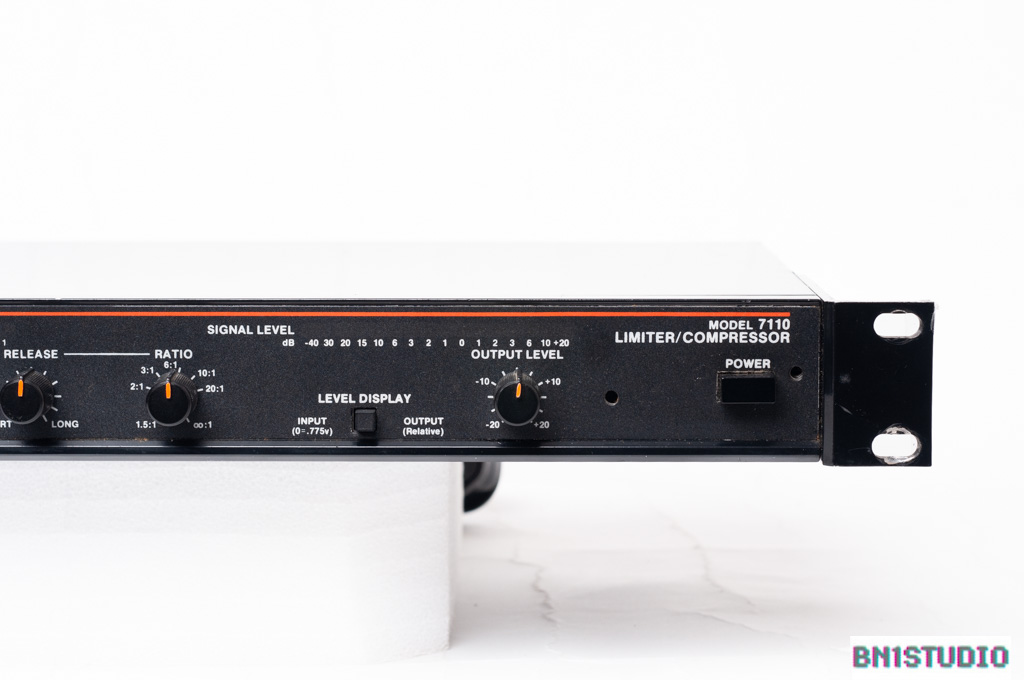 The UREI 7110 is a single-channel compressor in conventional format with attack & release controls and variable ratio. Unlike the 176 & LA-2A (valve) and the 1176 (FET) it uses a VCA as the gain control element. The front panel has the usual stereo link switch and an auto switch for program-dependent settings. There is no bypass switch