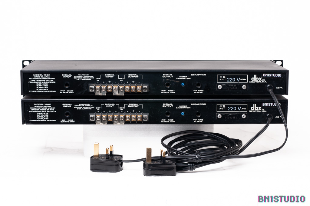 Stereo pair of dbx 160X compressors with close serial numbers. Refurbished & aligned in our workshops. They match well as a stereo pair, with or without stereo linking enabled. A stereo link cable is supplied. Photos show the compressors for sale