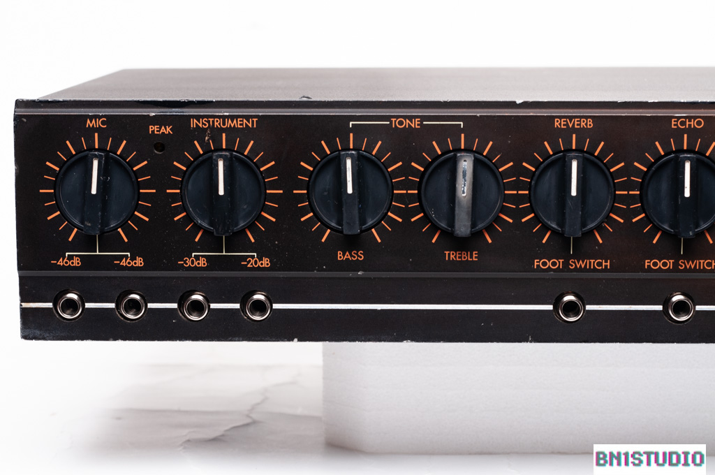 The EP-250 has mic & instrument inputs that mix to feed the 2-band EQ section. From there there is a Reverb level control and echo & repeat controls for the delay section. Delay time & feedback are continuously variable – a great feature when playing with feedback!