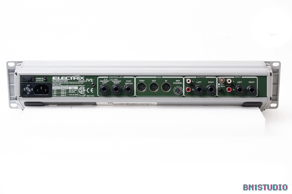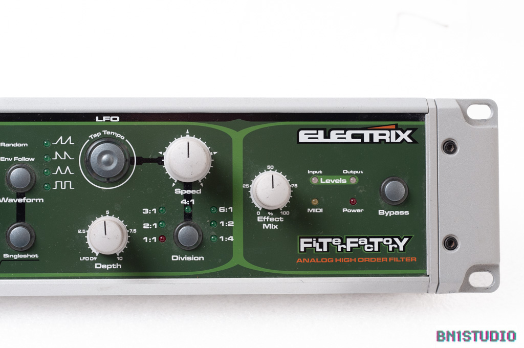 Rackmount filter unit from Electrix. The Filter Factory is what you’d get if you took a modular synth filter, coupled it to an LFO, tap-tempo generator and an envelope follower, then added a distortion section. Electrix also fitted separate CV L and R inputs for the filter frequency, equipped it with real-time midi control and built it into one of their trademark slope-front rackmount / desktop aluminium boxes