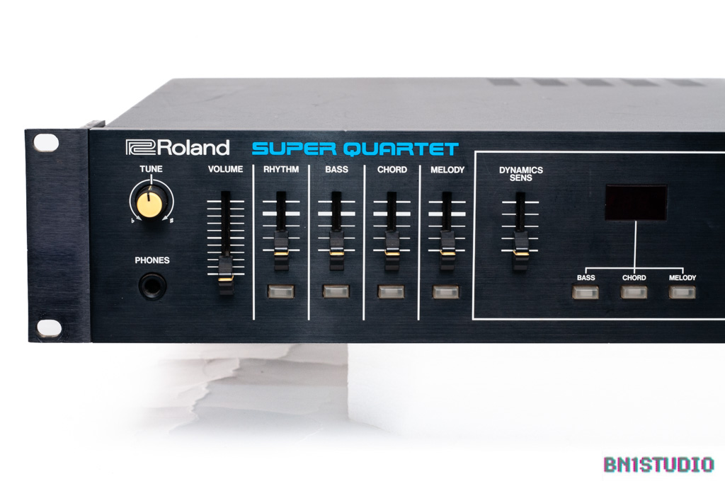 “A strange module with 4 sections (the “quartet”) basically – but not totally – it’s a multitimbric Juno-106 with drum machine from Roland Tr-707 in a whole rack unit.”