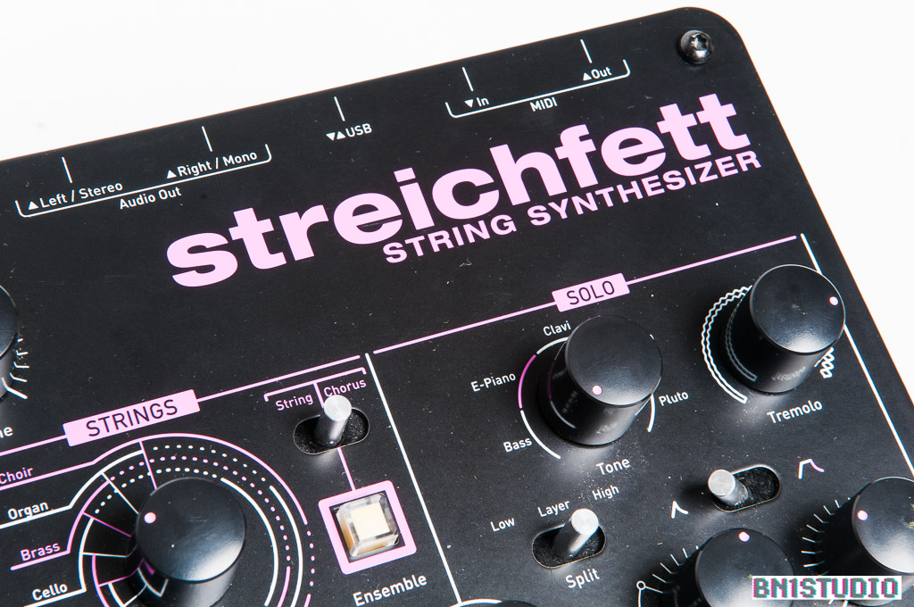 The Streichfett is a an oddball amongst modern synths – it may look back in time towards 70s string synths, but it’s relentlessly modern in execution. It’s super-fast to use – the front panel controls are live all the time and transmit midi controller messages, so it can be recorded & manipulated from a DAW. It’s easy to create sounds, blending the Strings & Solo sections together, and there are four user memories to save to