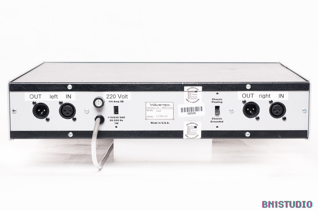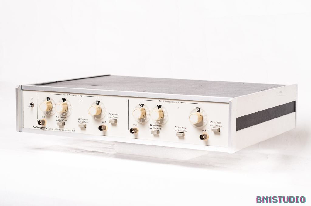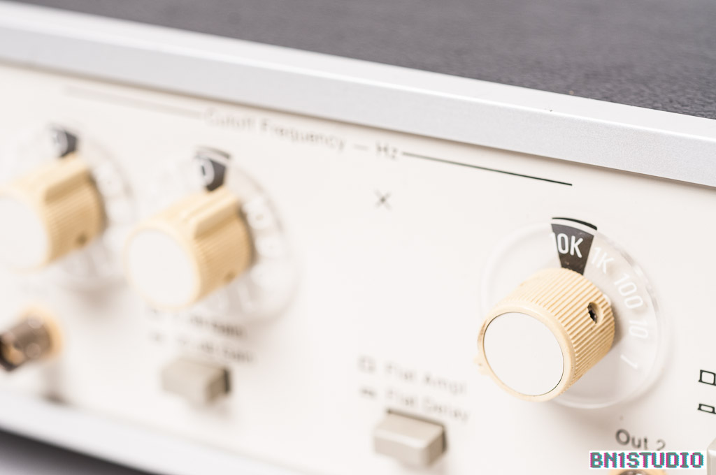 There are two separate channels, each with a two-digit frequency selector and a 10 / 100 / 1k / 10k multiplier switch. There is also a 20 dB gain switch and a flat amplitude / flat delay switch that determines the response at the corner frequency. In our hands this becomes a “do I prefer how it sounds this way.. or that?” switch